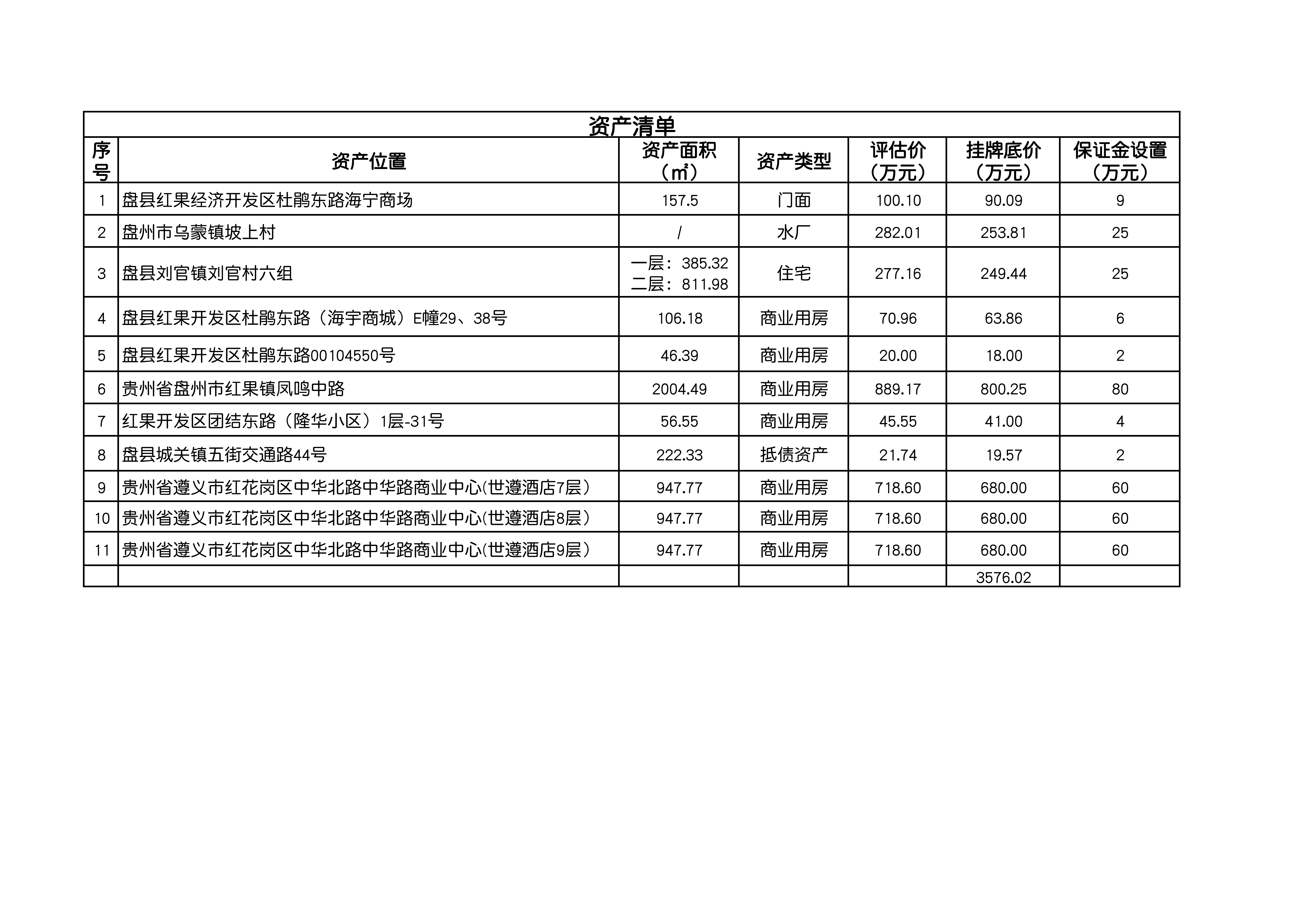| 資產(chǎn)公告信息 | 資產(chǎn)描述 | 本次擬轉(zhuǎn)讓的資產(chǎn)共計11處,8宗資產(chǎn)位于貴州省盤州市、3宗資產(chǎn)位于貴州省遵義市紅花崗區(qū)中華北路中華路商業(yè)中心(各標(biāo)的情況詳見附件清單) | ||||||